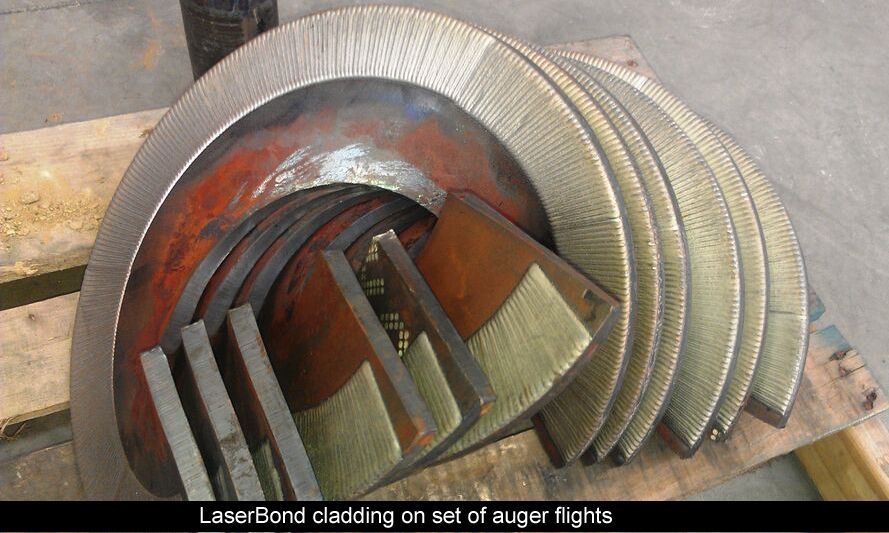 • The wear resistant layer of LaserBond® cladding was applied to outside diameter and faces of the flights, the top shaft journal and the leading edge of the auger.
